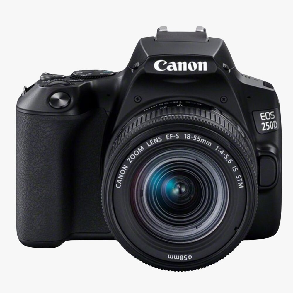 Canon EOS 250D with 18?55mm lens, a compact, lightweight DSLR with a 24.1MP sensor, 4K video, and Dual Pixel AF for sharp photos and smooth, cinematic footage.